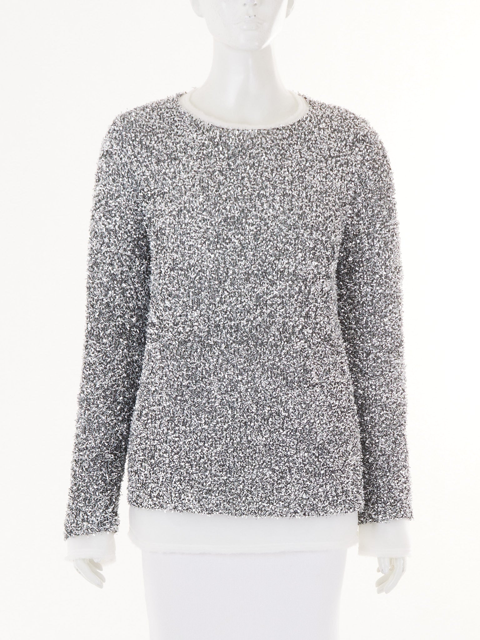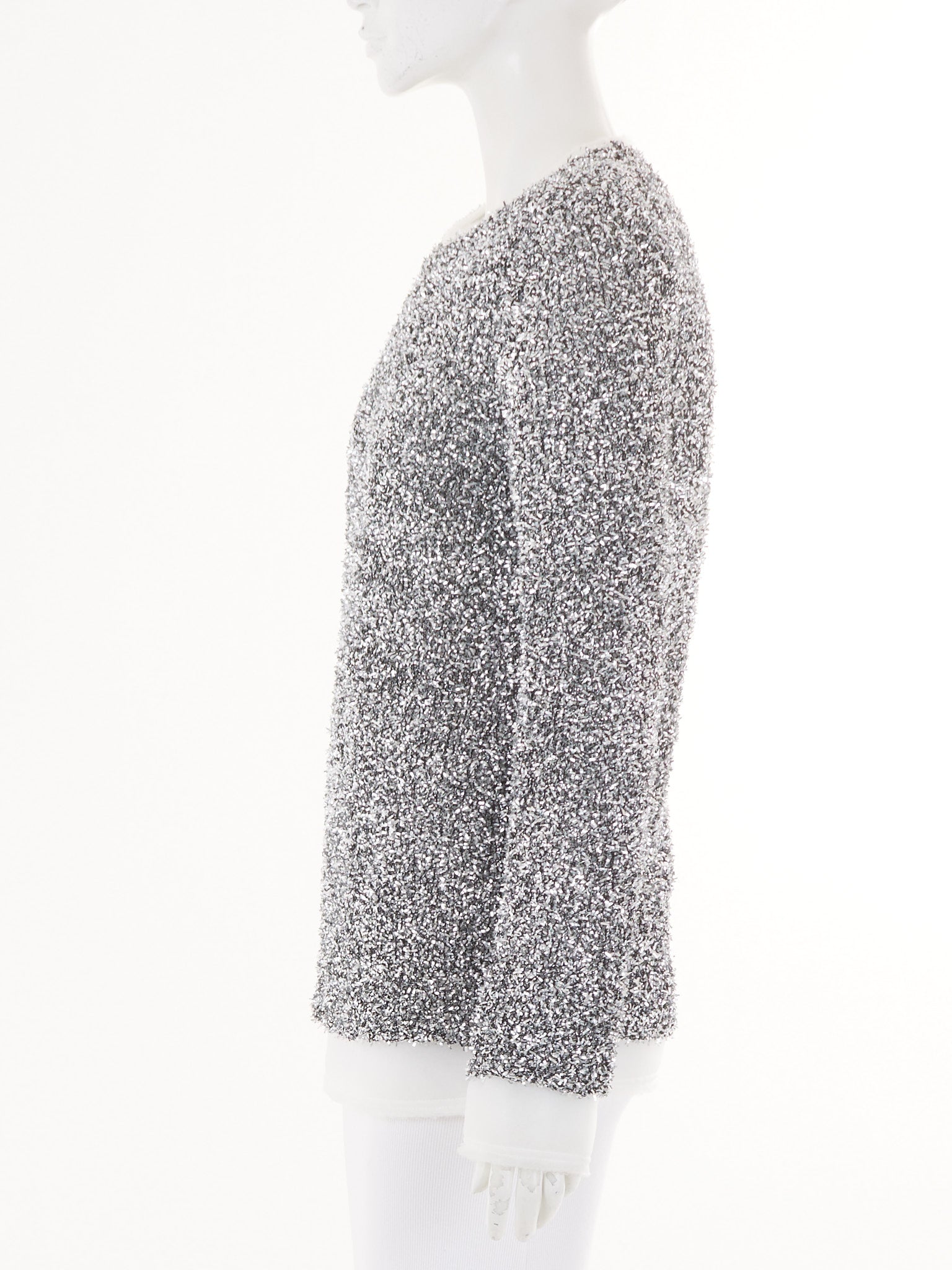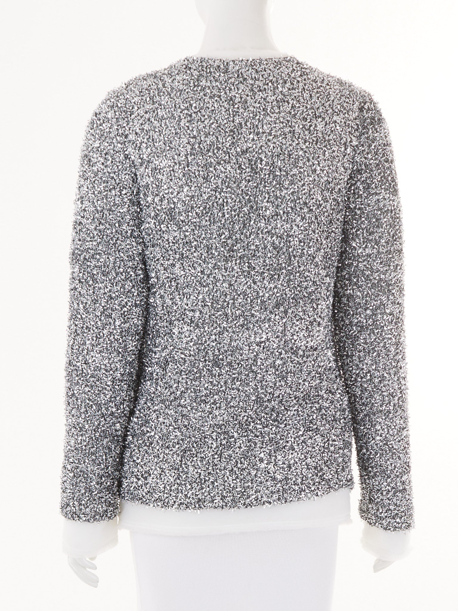 This Comme Des Garçons tinsel padded top merges avant-garde aesthetics with functional design, featuring shimmering metallic detailing layered over structured padding for dimensional visual impact. The piece balances theatrical glamour with architectural precision, creating a distinctive silhouette that commands attention through innovative material exploration and expert craftsmanship.