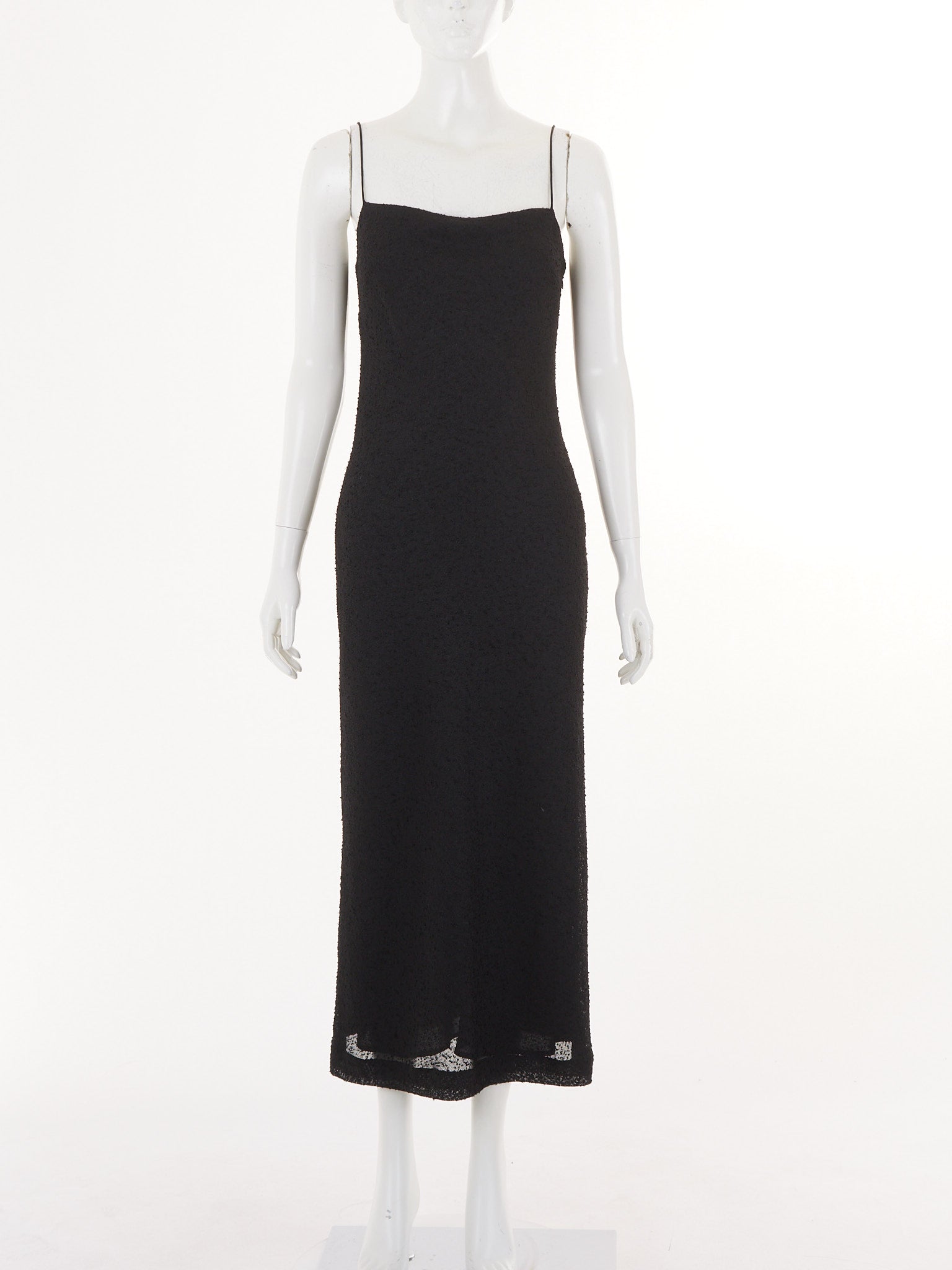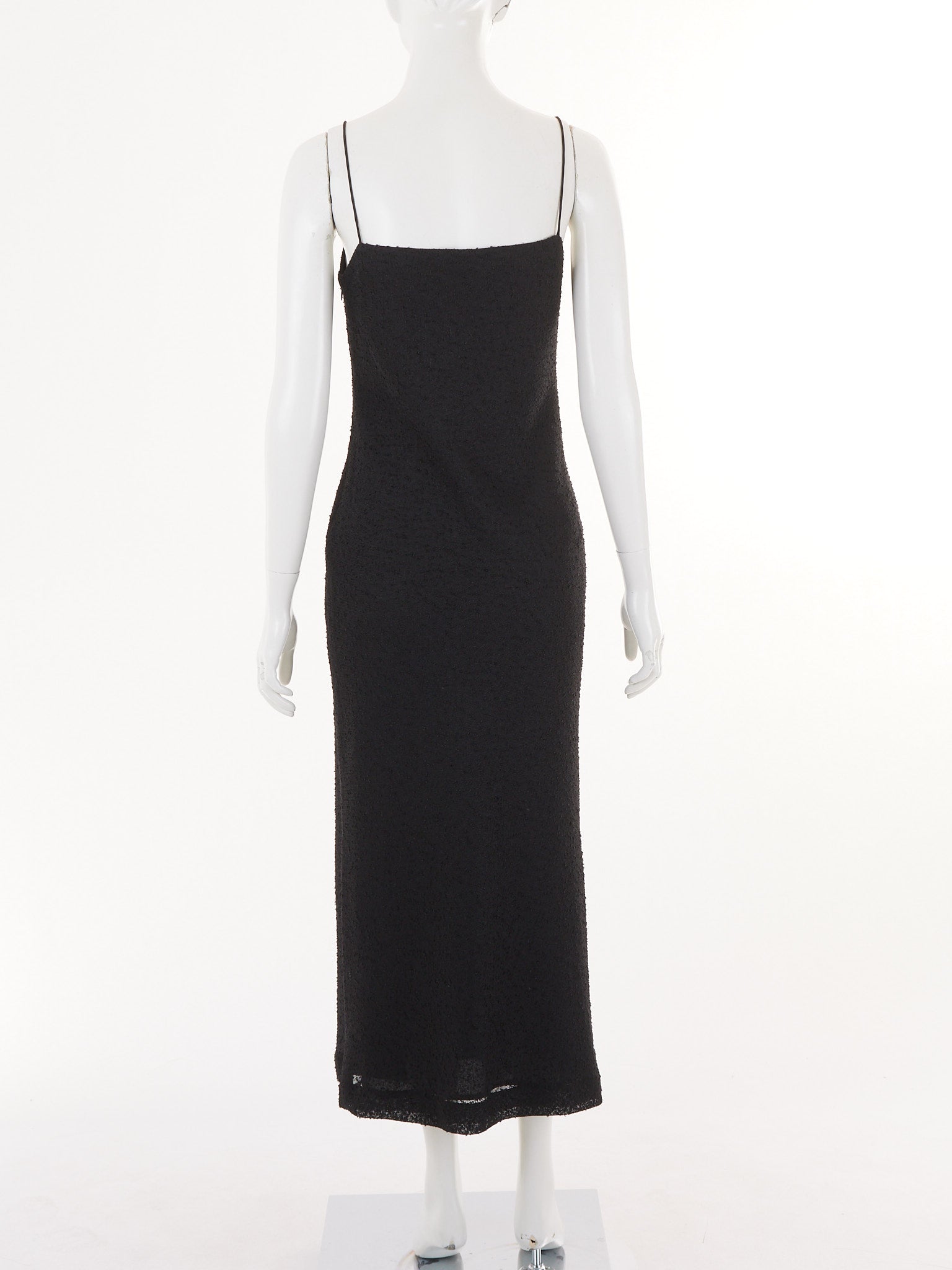 Effortless elegance in a textured midi dress featuring a chic square neckline and delicate shoestring straps. Perfect for elevated everyday wear or special occasions.