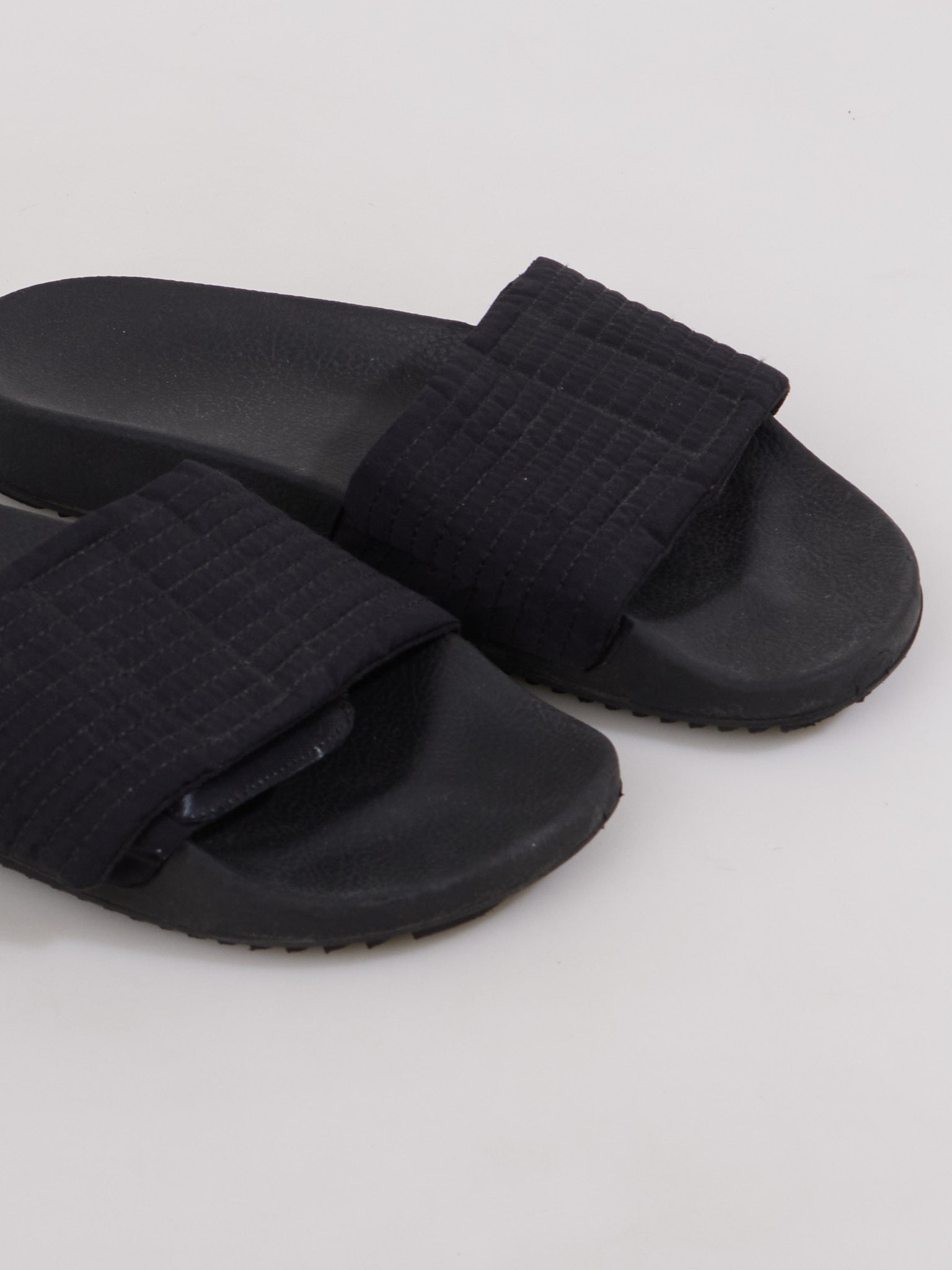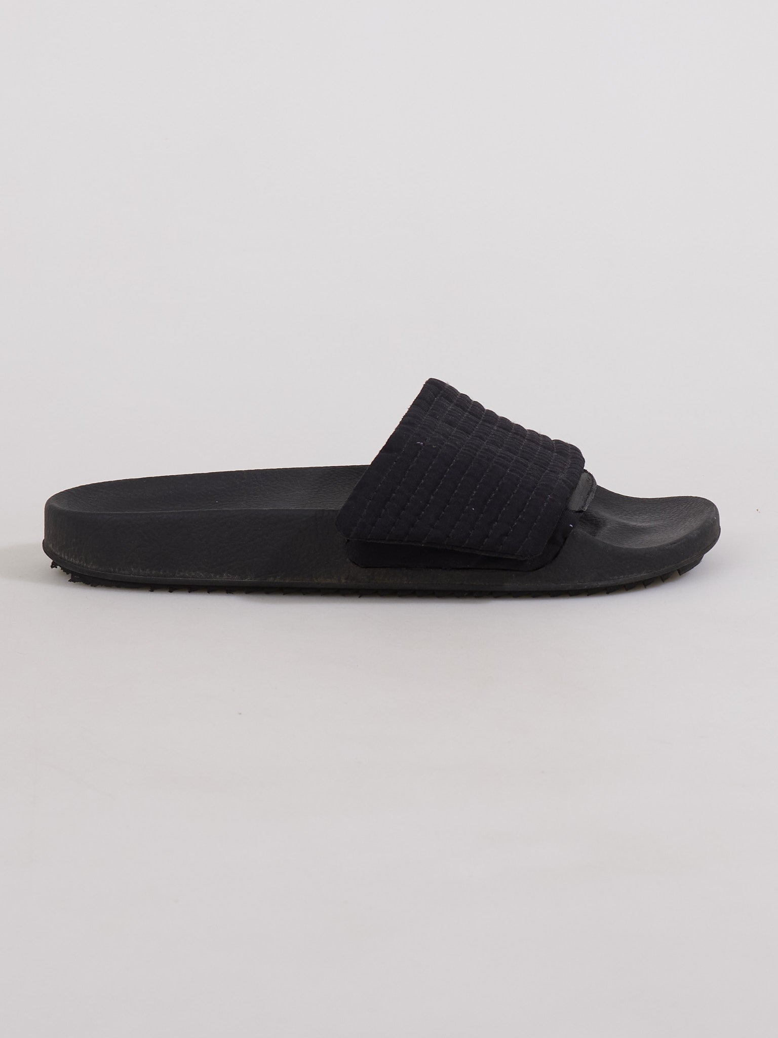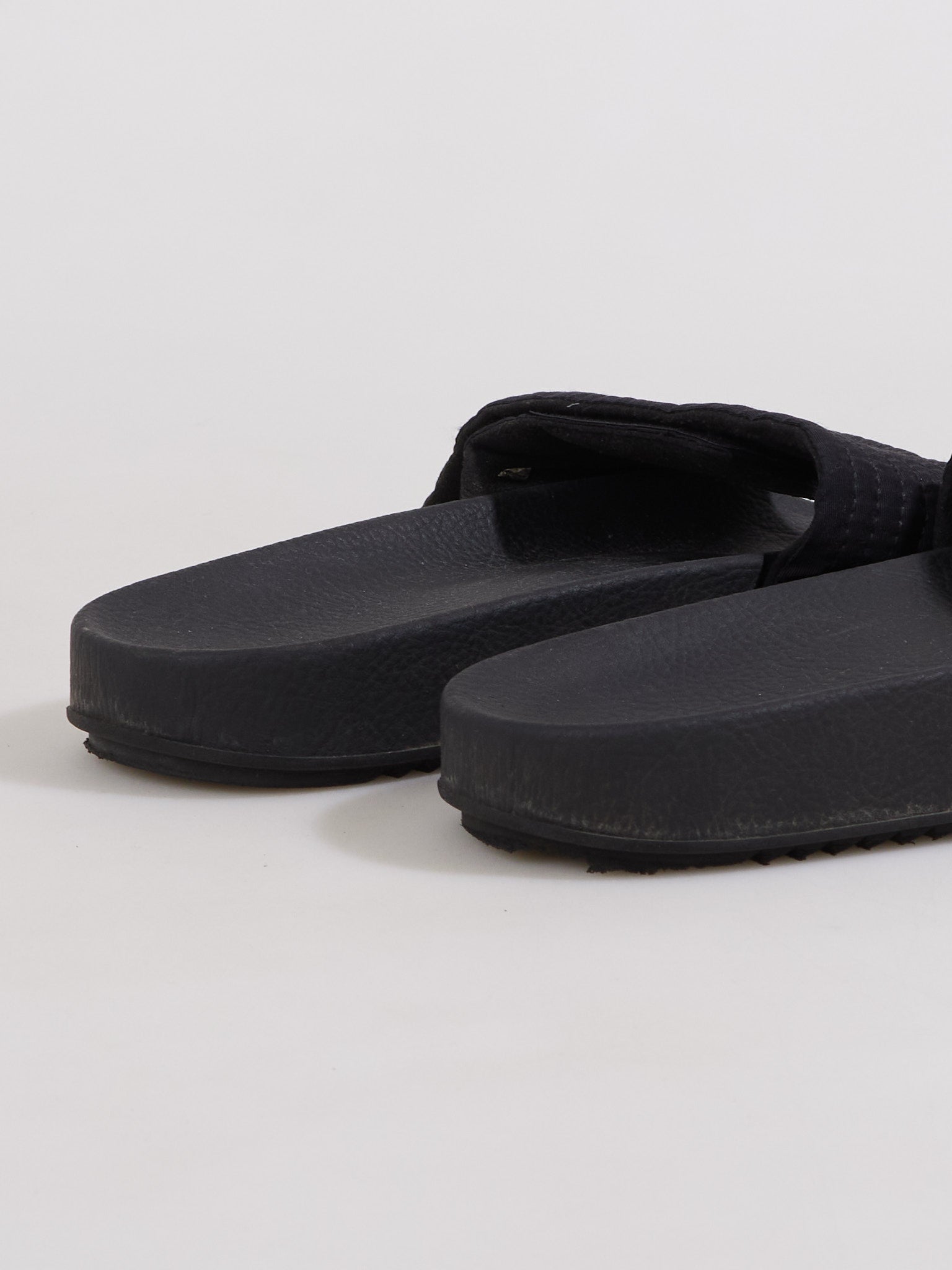 Architectural slide sandals featuring Rick Owens Drkshdw's signature minimalist aesthetic with a chunky rubber sole and streamlined silhouette.