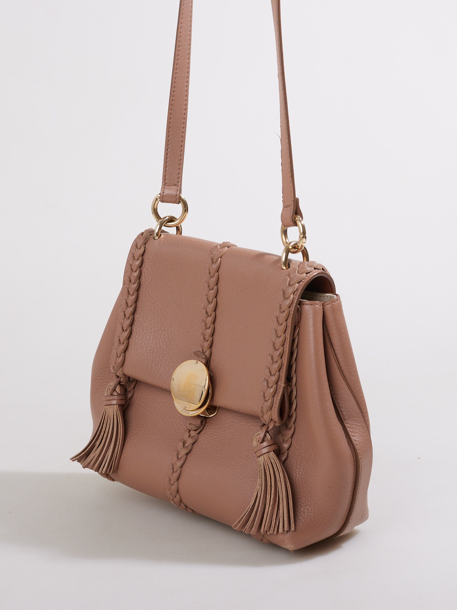 The Chloé Leather Penelope shoulder bag combines supple leather construction with a gracefully curved silhouette and adjustable strap, embodying the house's signature blend of romantic femininity and practical sophistication.
