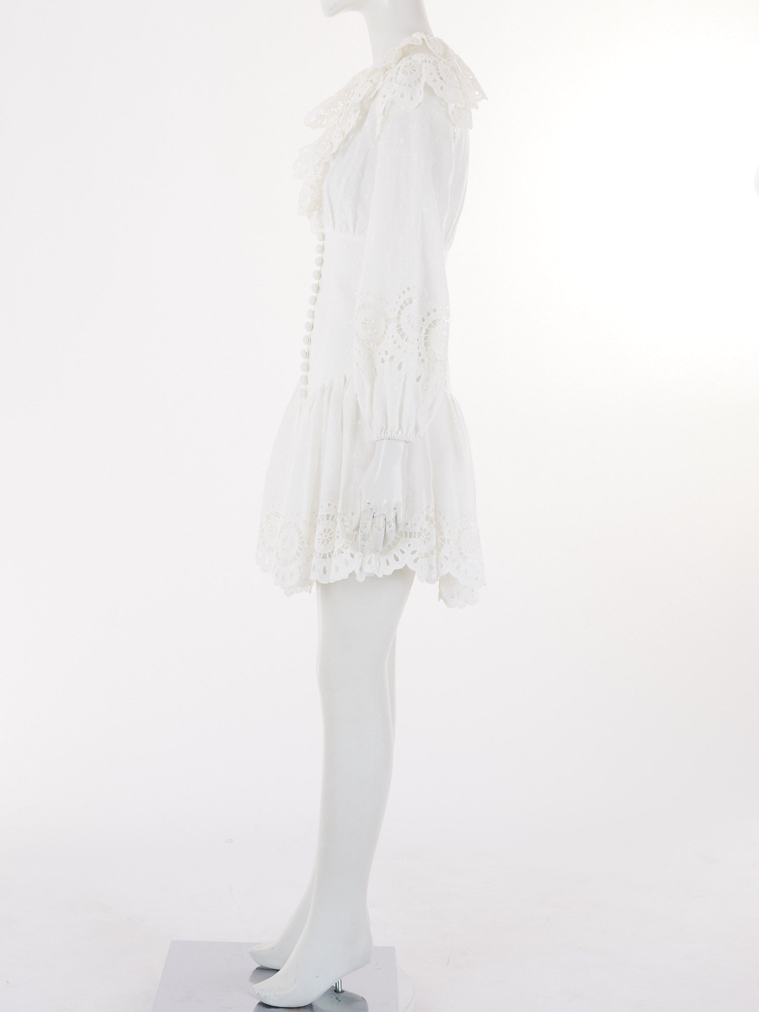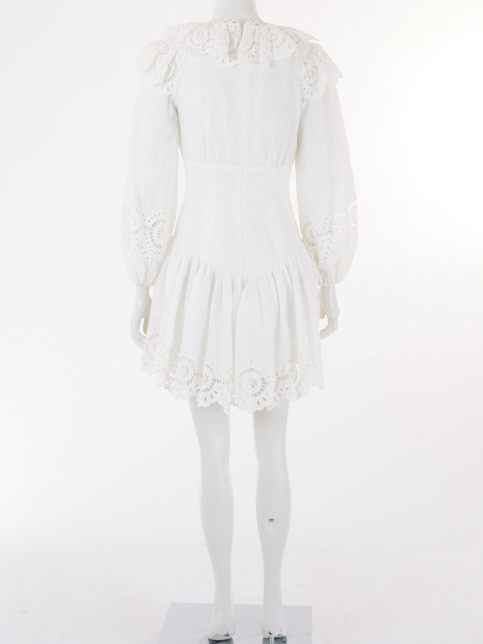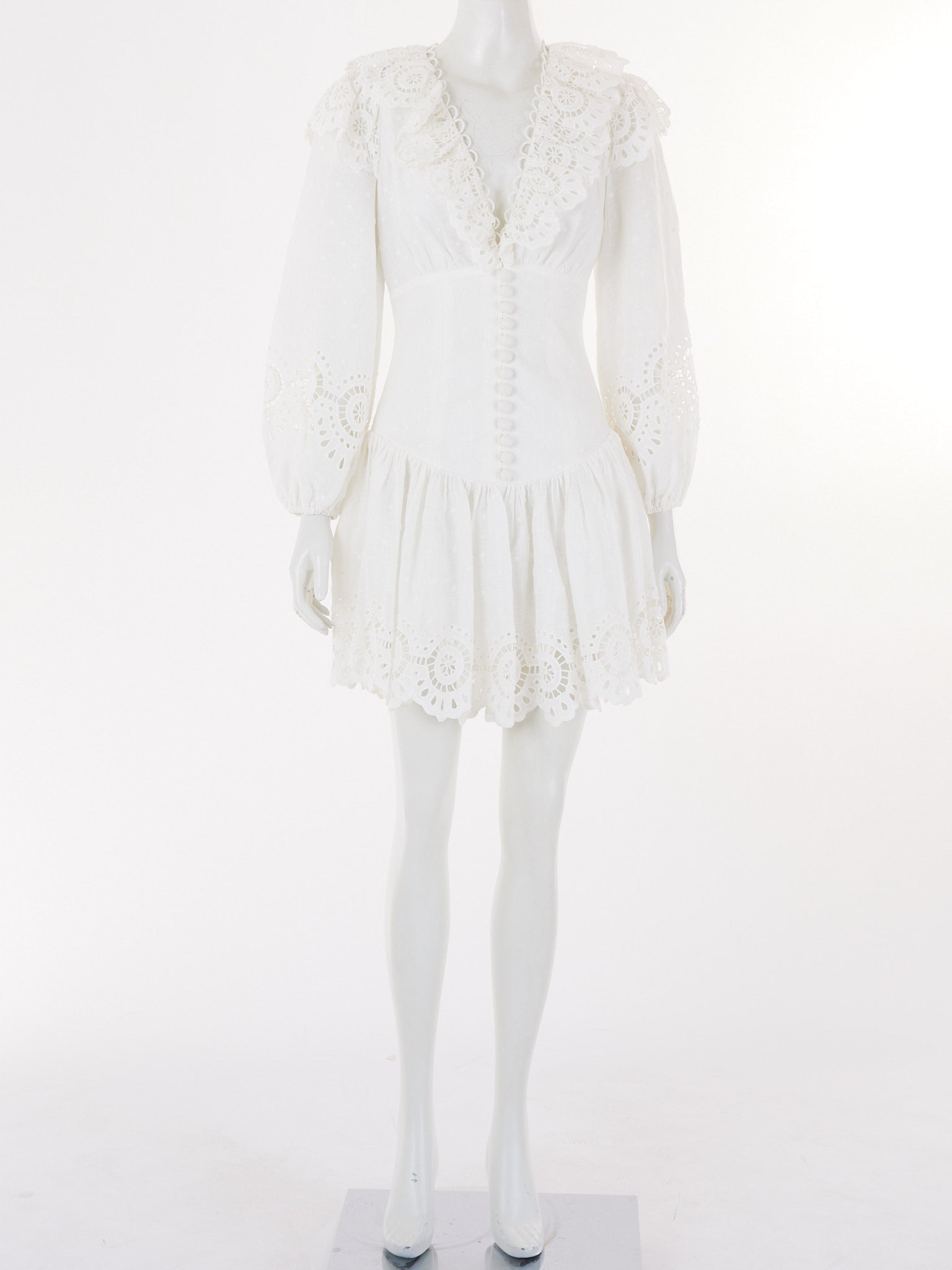 The Bellitude mini dress showcases Zimmermann's signature feminine aesthetic with delicate scalloped detailing and a refined silhouette that captures effortless Australian luxury.