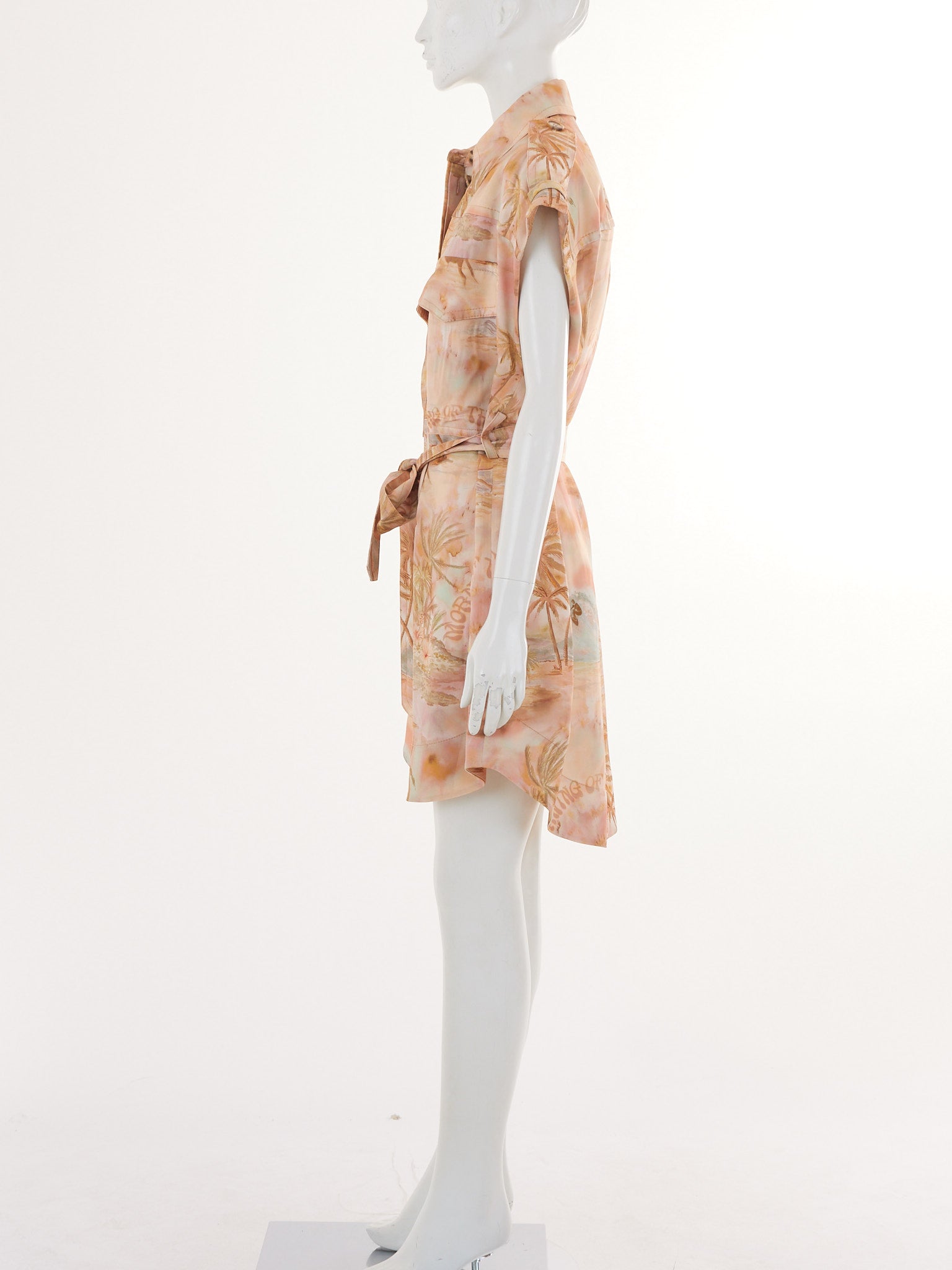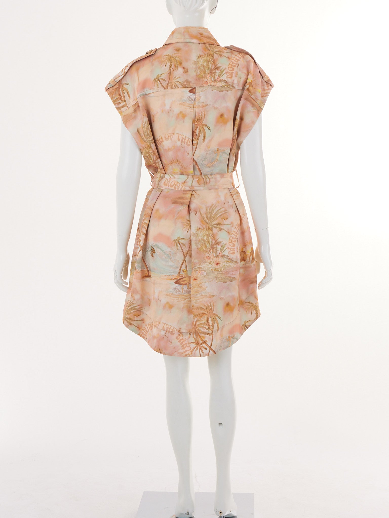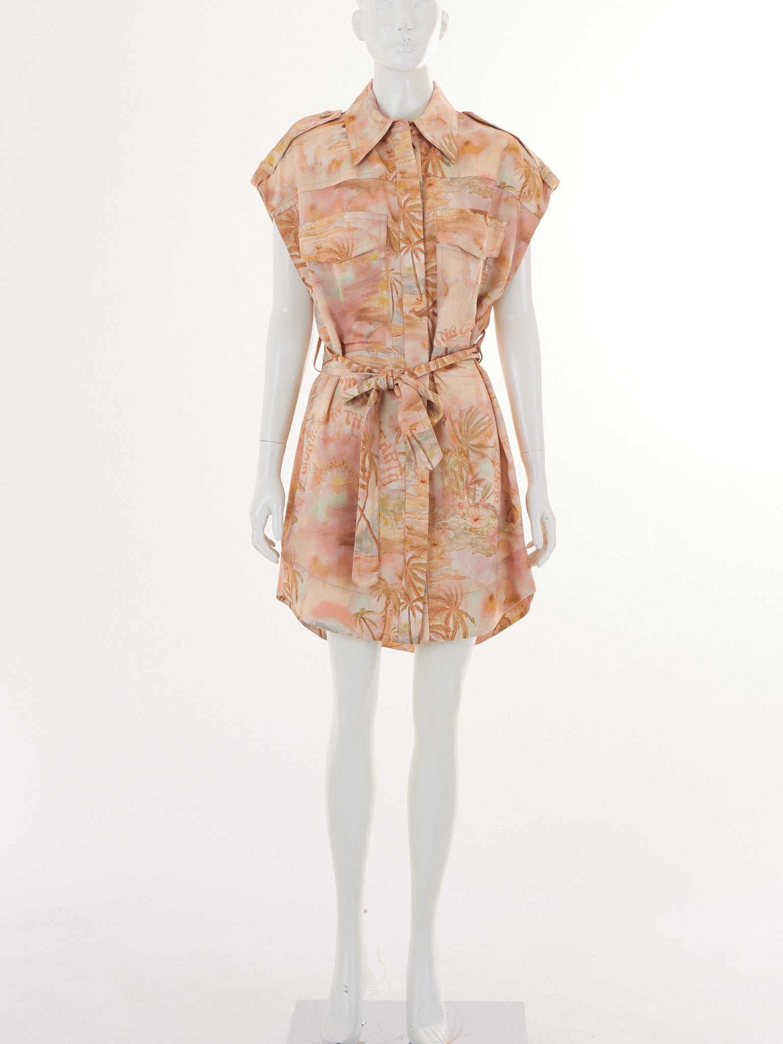 Effortless summer style in this Zimmermann 'Illuminate' belted mini dress. Featuring a charming peach beach print, pointed collar, and functional front chest pockets, it's designed for relaxed elegance. The button closure and cinched waist create a flattering silhouette perfect for warm-weather dressing.