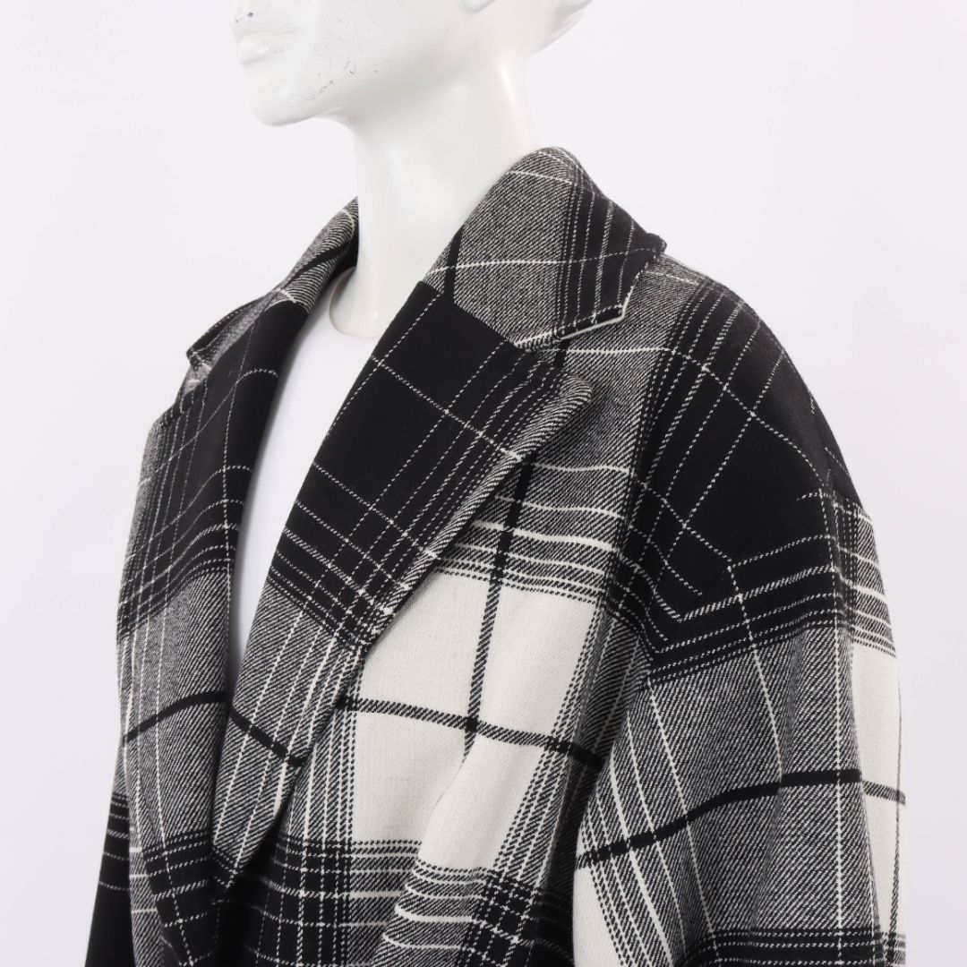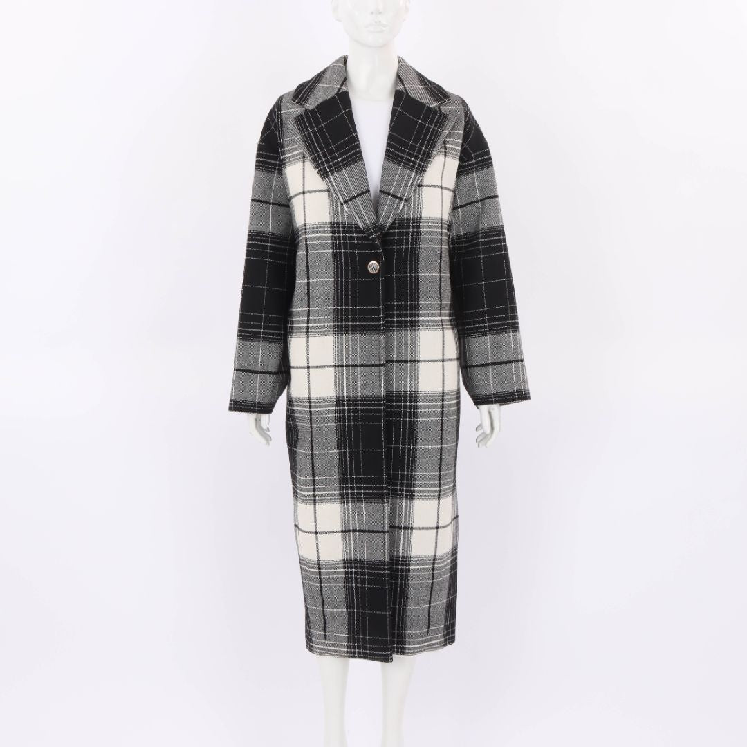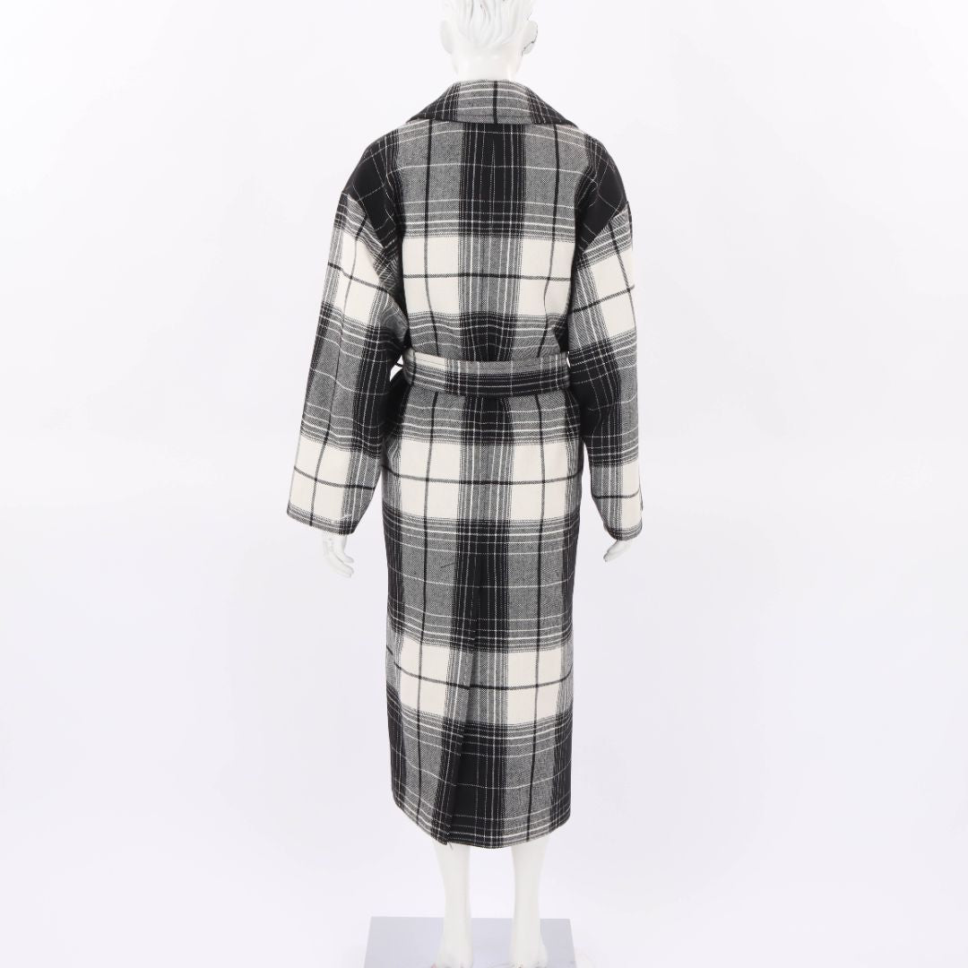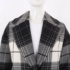 This wool blend trench coat features a sophisticated plaid pattern with a precisely cut silhouette, combining heritage outerwear craftsmanship with contemporary tailoring details.